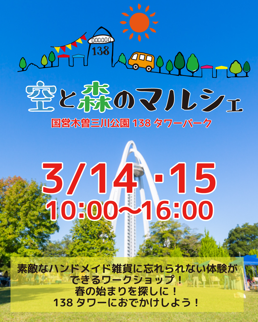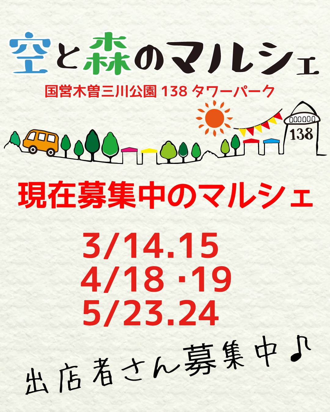 2026年春開催の空と森のマルシェです。 出店者さん、ステージパフォーマンス募集しております。 3/14.15  応募フォーム4/18.19  応募フォーム5/23.24  応募フォーム 野外ステージ希望の方はこちらからView More